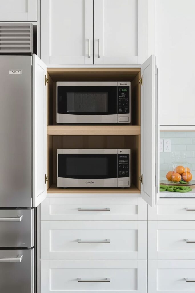 Instead of leaving appliances on counters, modern kitchens integrate them into dedicated cabinets or appliance garages.