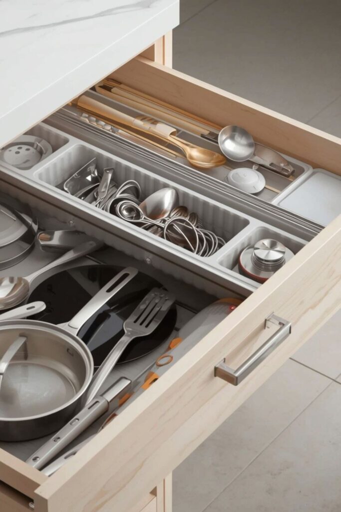 Replacing traditional shelves with drawers improves accessibility and organization. Deep drawers allow cookware, utensils, and pantry items to be stored visibly without stacking.