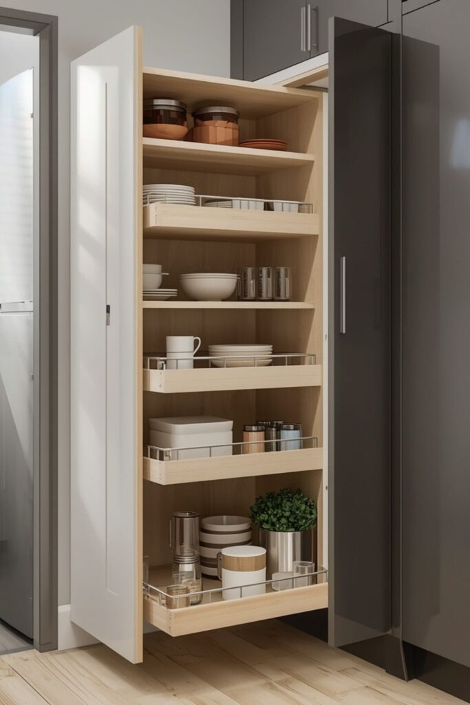 Pull-out pantry units are ideal smart storage solutions for kitchen layouts with tight gaps. These slim units slide out smoothly, revealing organized shelves that store dry goods and essentials efficiently.
