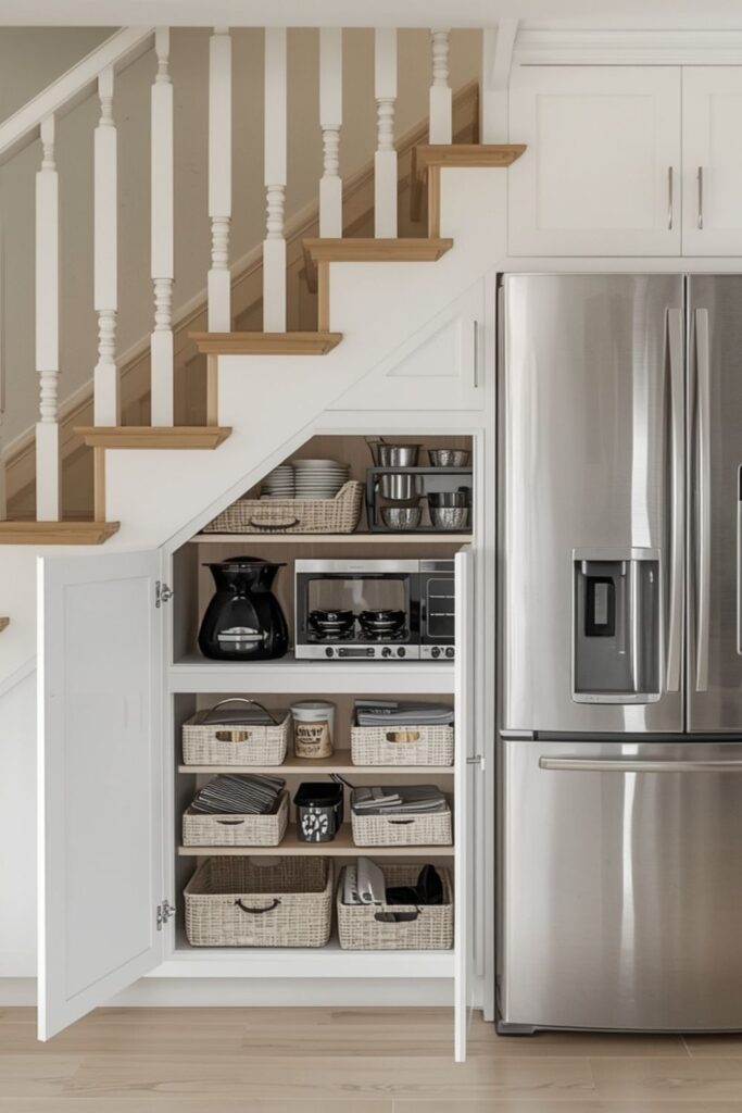 In homes with staircases near the kitchen, under-stairs storage offers hidden potential. Cabinets, pull-out drawers, or pantry units beneath stairs can store appliances, supplies, or dry goods discreetly.