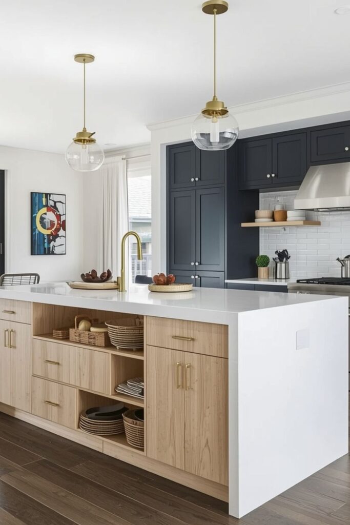 Kitchen islands and peninsulas can quietly handle significant storage. Cabinets and drawers hidden within these structures store cookware or pantry items without altering the kitchen’s exterior appearance.