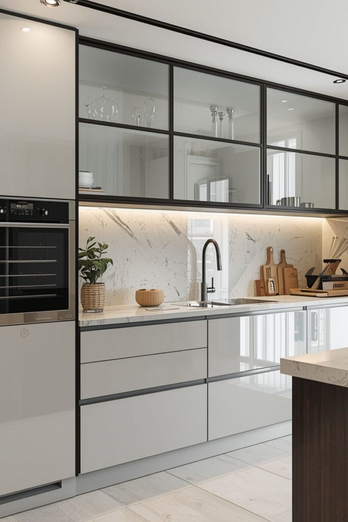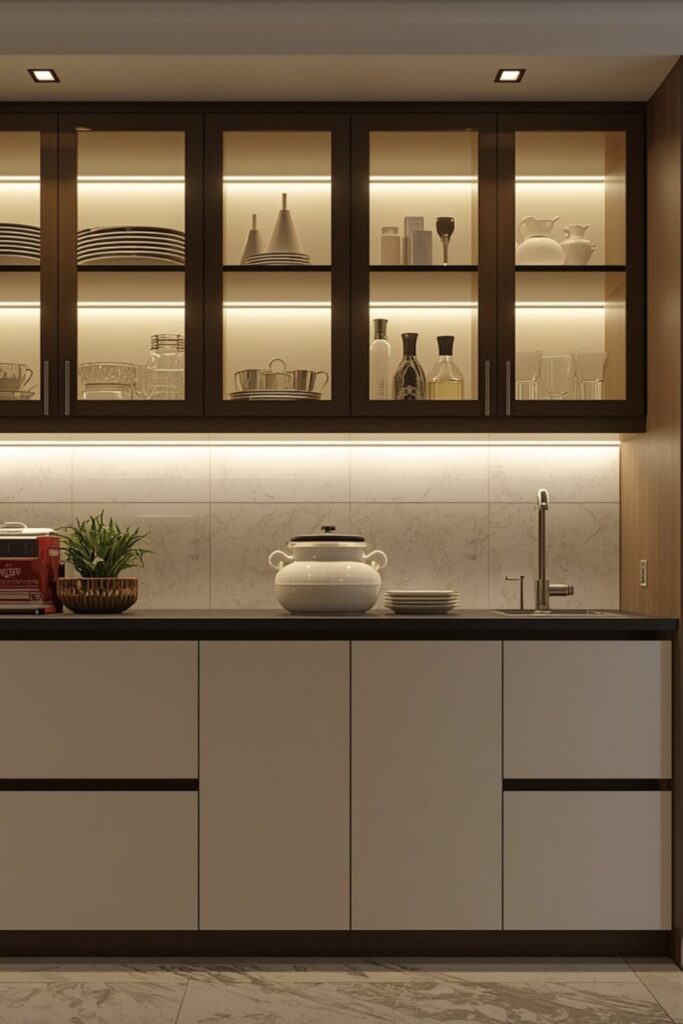 Integrating LED lighting inside glass cabinets adds a dramatic yet elegant touch. The illumination highlights crockery and enhances overall kitchen brightness. This design blends functionality with modern sophistication.