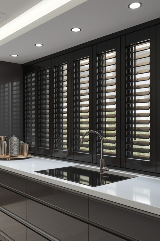 Full glass shutters without heavy framing create a seamless, ultra-modern look. They reflect light beautifully and make kitchens appear larger. This style is perfect for open, airy layouts.