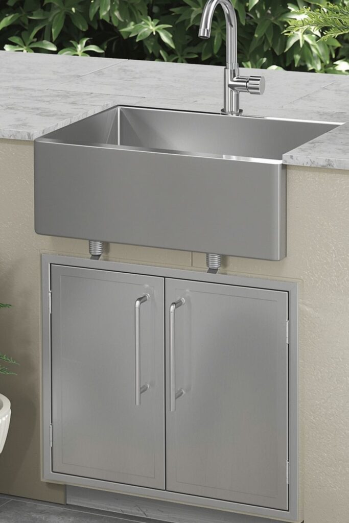 A stainless steel sink paired with a weather-resistant cabinet offers durability and sleek appeal. This setup protects plumbing while providing storage for cleaning supplies and utensils. It’s ideal for 10 stylish outdoor kitchen sink ideas with cabinet designs.