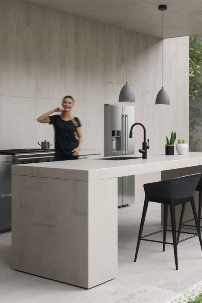 Concrete is durable and withstands heat and moisture effectively. Pair it with matte black fixtures for a striking contrast. This idea frequently appears in outdoor kitchen designs pictures featuring urban backyard setups.