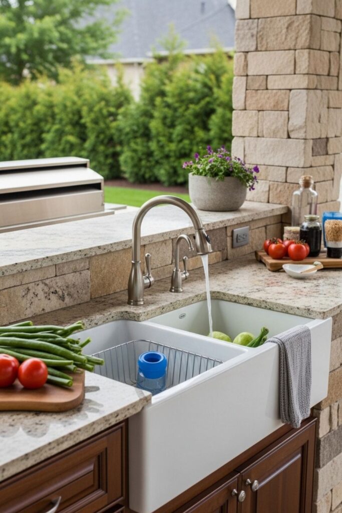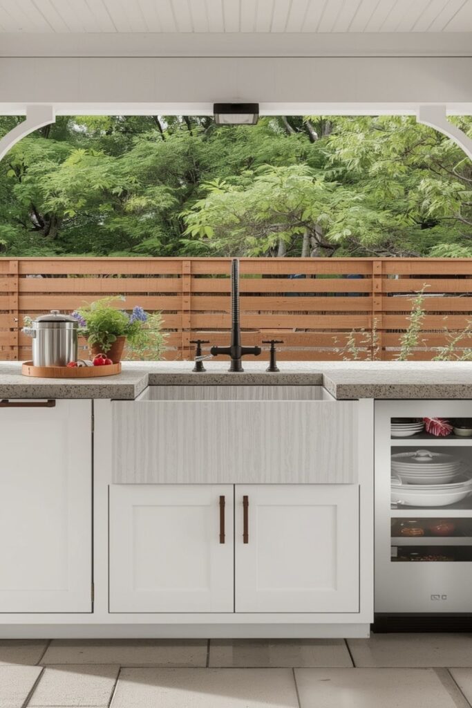 A farmhouse apron sink adds charm and character to your outdoor space. Its deep basin is perfect for washing large cookware after grilling sessions. This style blends rustic warmth with modern backyard layouts.