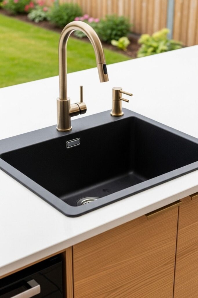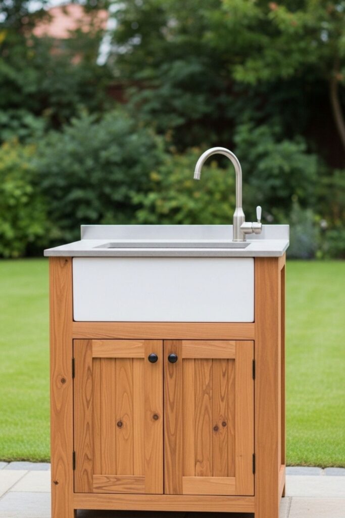 A sink installed over a treated wooden cabinet base adds warmth to modern backyards. The wood softens the look of metal fixtures and creates a balanced aesthetic. It’s a stylish yet natural option.