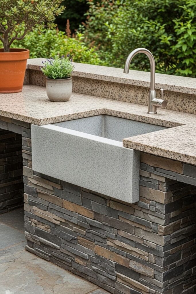 When placed under a covered outdoor kitchen area, it becomes both decorative and functional. White or matte stone finishes enhance the aesthetic. It’s one of the most visually appealing 10 Stylish Outdoor Kitchen Sink Ideas for Modern Backyards.