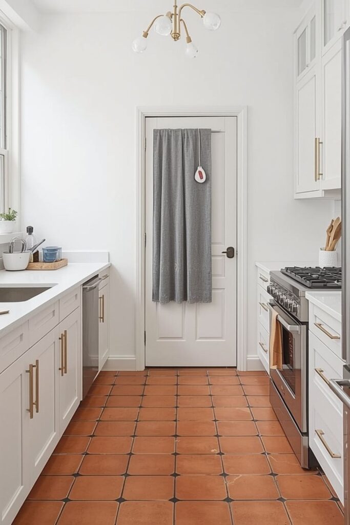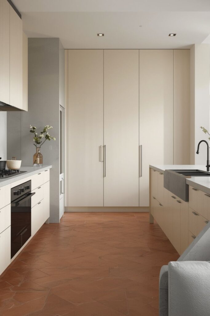 Modern terracotta floor tile kitchen ideas focus on pairing traditional materials with clean lines and minimal styling. Flat-front cabinets, soft neutral walls, and simple lighting allow the terracotta floor to stand out without competing elements.