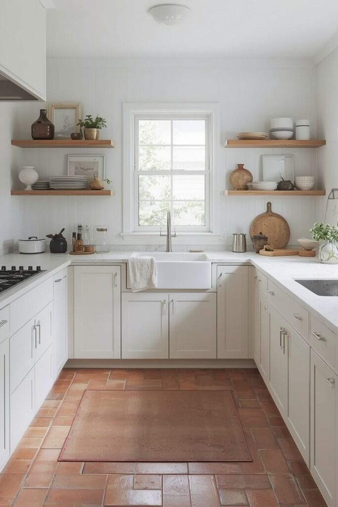 Terracotta floor tile kitchen ideas Pinterest searches often show relaxed, sunlit kitchens with open shelving and natural textures. Pinterest inspiration highlights how terracotta floors pair beautifully with white walls, linen textiles, and handcrafted ceramics.