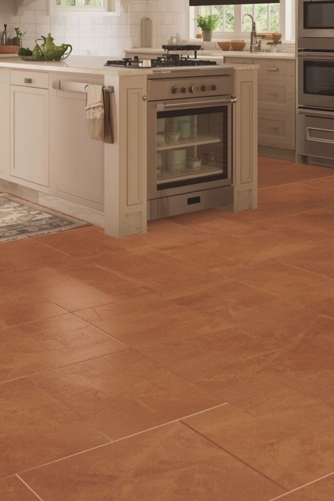 Terracotta porcelain tile kitchen options offer the look of traditional clay with added durability and easier maintenance. These tiles resist stains and moisture while maintaining the warm appearance of real terracotta.