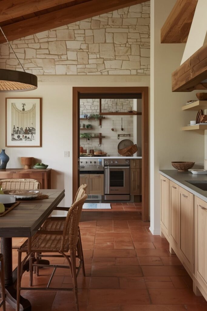 Terracotta kitchen ideas often combine clay flooring with natural materials like wood, stone, and woven textures. Wooden cabinets, stone countertops, and ceramic accessories complement terracotta floors beautifully.