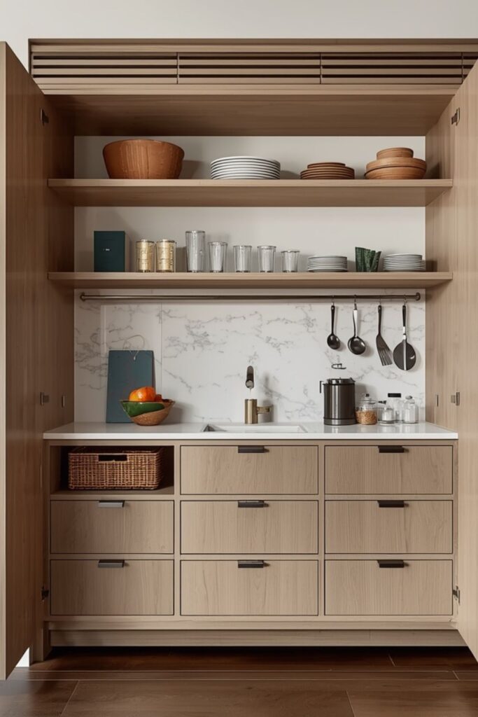 This idea appears frequently in 10 kitchen trends in 2026 USA, where open-plan homes demand smart containment. Pantry zones help kitchens feel organised without sacrificing openness. Whether in large homes or compact layouts, this trend reflects a growing preference for kitchens that function smoothly without constant visual reminders of daily mess.