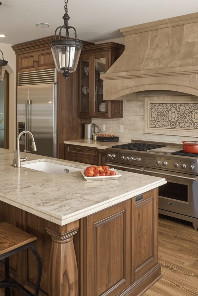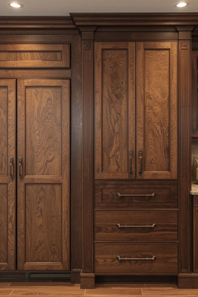 Dark walnut, chestnut, or honey-toned wood cabinets add depth and authenticity. These cabinets often feature decorative molding, antique-style handles, and traditional paneling.