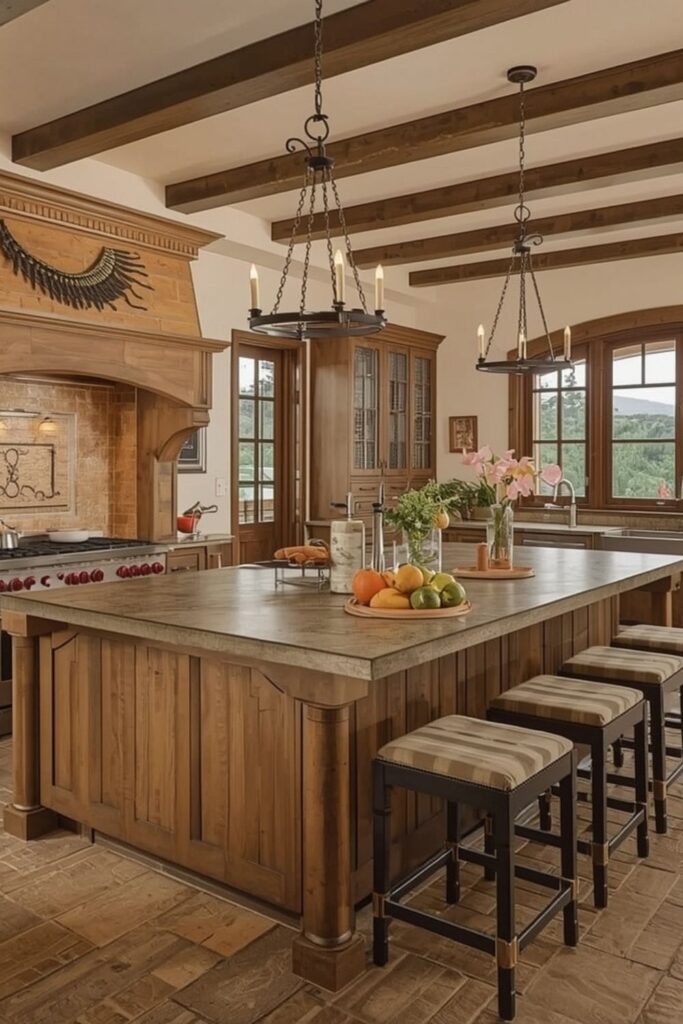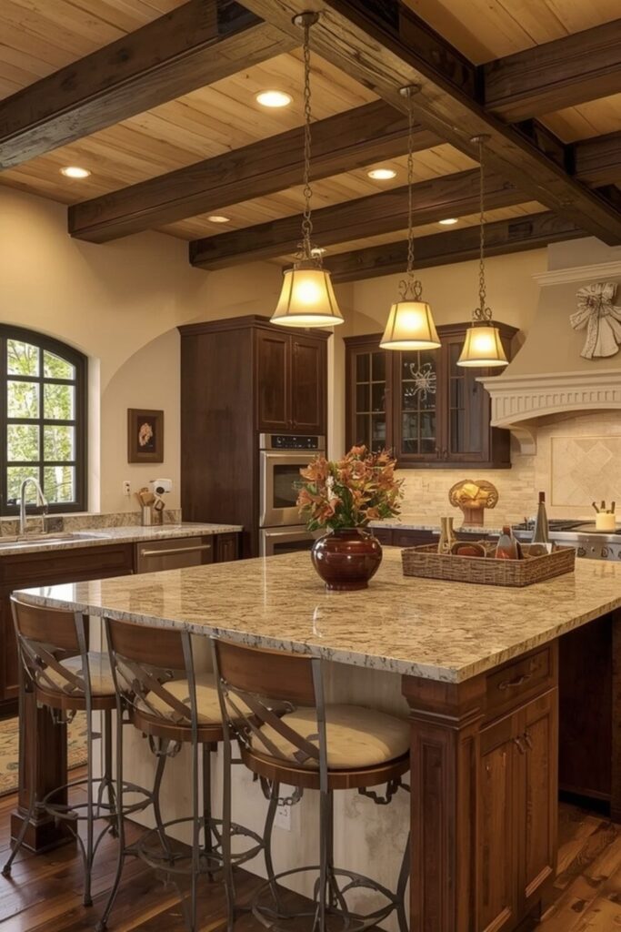 These architectural details create visual depth and pair well with rustic cabinetry and stone textures.