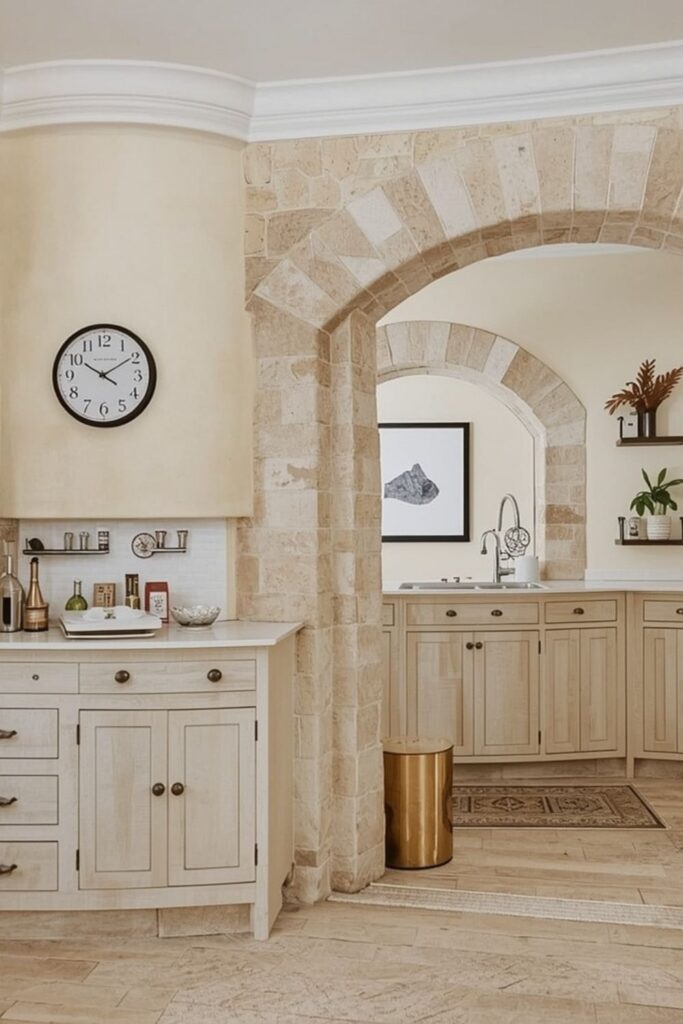 Arches are common in traditional Italian kitchens and add softness to the space. Arched doorways, windows, or built-in niches help kitchens feel more fluid and organic.