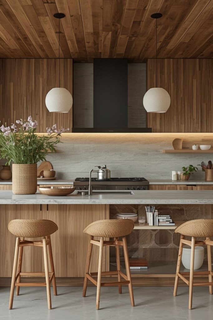 Warm Organic Modern Kitchen Elements bring nature into modern interiors. Materials such as wood, stone, clay, and linen add texture and warmth without introducing strong colours. These elements soften the clean lines of modern kitchens and make them feel more human.