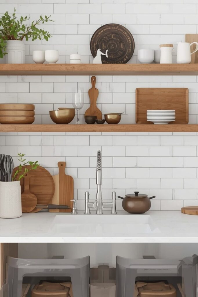 Pinterest has become a major source of inspiration for warm kitchens. Pinterest-inspired warm modern kitchen decor often features simple styling, natural accessories, and uncluttered surfaces. Open shelves with ceramics, wooden boards, and subtle greenery add warmth without excess decoration.
