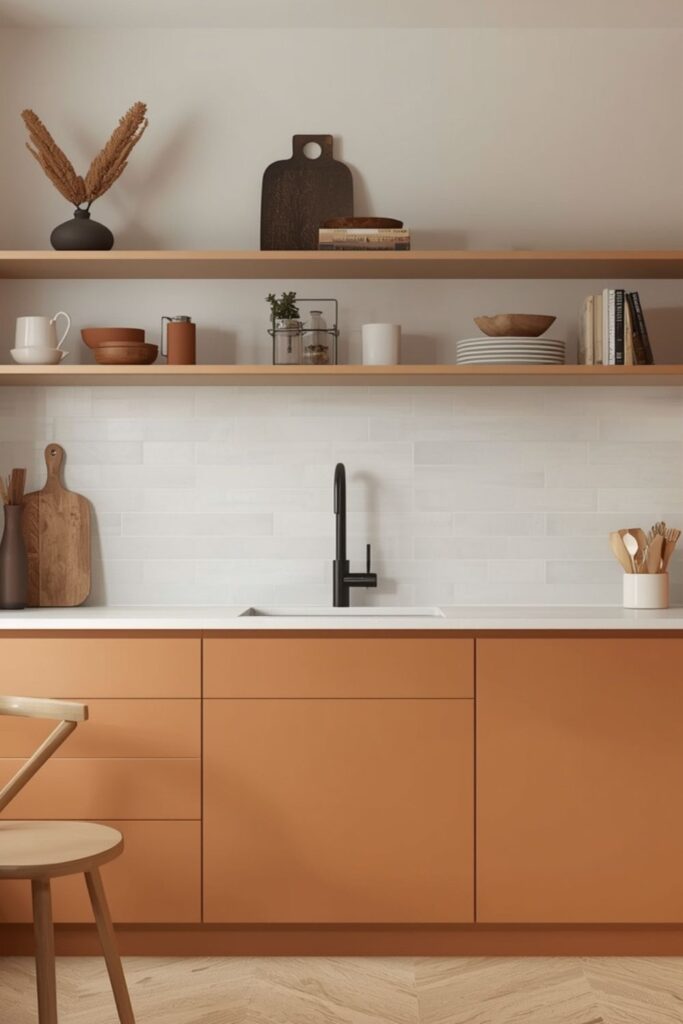 Small kitchens benefit greatly from warm minimalism. Small kitchen decorating ideas focus on reducing clutter while adding warmth through texture and colour. Simple shelves, warm-toned cabinets, and soft lighting help compact kitchens feel more open and welcoming.