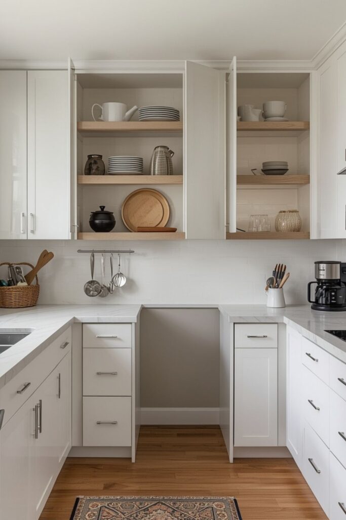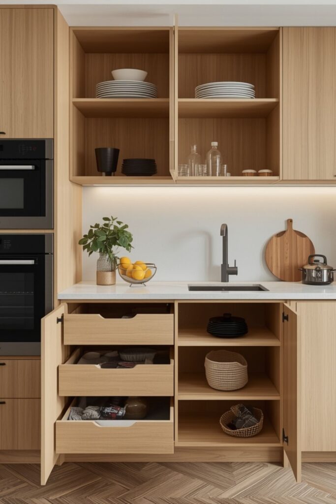 Warm modern kitchens use storage as a design element rather than hiding it completely. Wood finishes, soft tones, and simple hardware keep storage visually light and cohesive.
