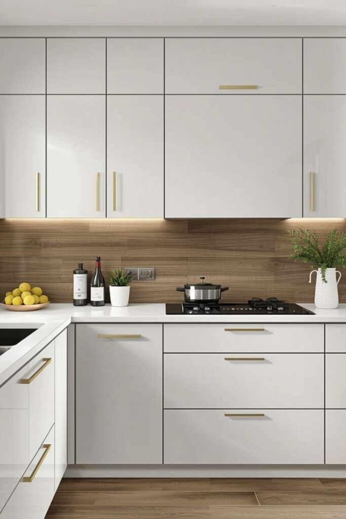 Handle-less cabinets are a popular choice in modern chic small kitchen ideas because they reduce visual noise. Clean cabinet fronts create uninterrupted lines, which makes the kitchen feel larger and more refined. This style works especially well in very small kitchens where every detail is visible.