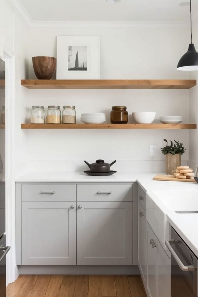 The key is minimal styling—neatly arranged dishes, glass jars, or neutral décor pieces. When shelves are kept uncluttered, they add character without sacrificing the chic and organized look small kitchens need.