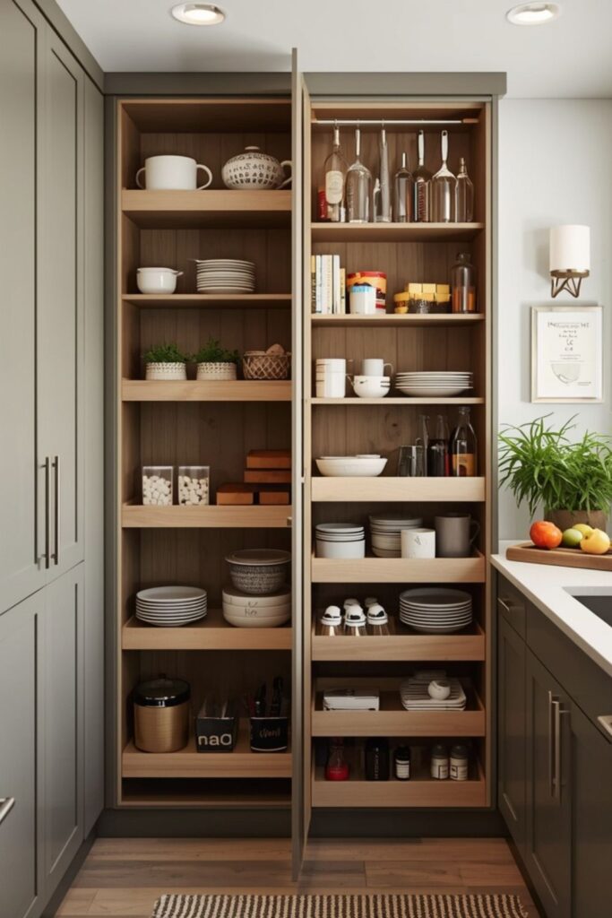 Using vertical space smartly is one of the best ways to make a small kitchen feel organized and stylish. Tall cabinets, vertical pull-out units, and slim pantry storage keep essentials hidden and surfaces clean.