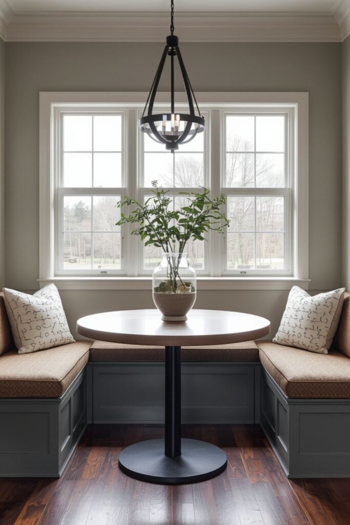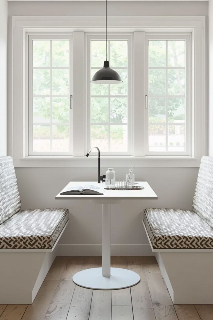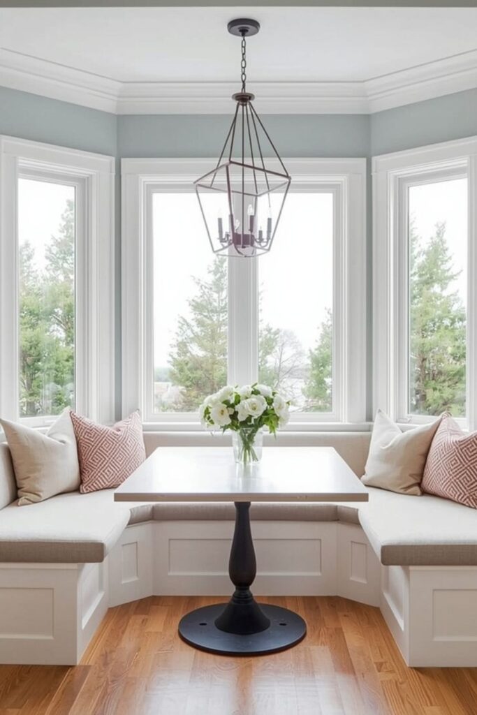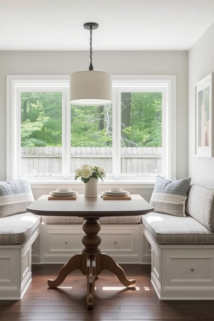 A built-in dining nook near a window is one of the most timeless dining nook ideas. Natural light instantly makes the space feel welcoming, while built-in benches help save floor area. This setup works especially well in kitchens where wall space is limited but a corner window is available.