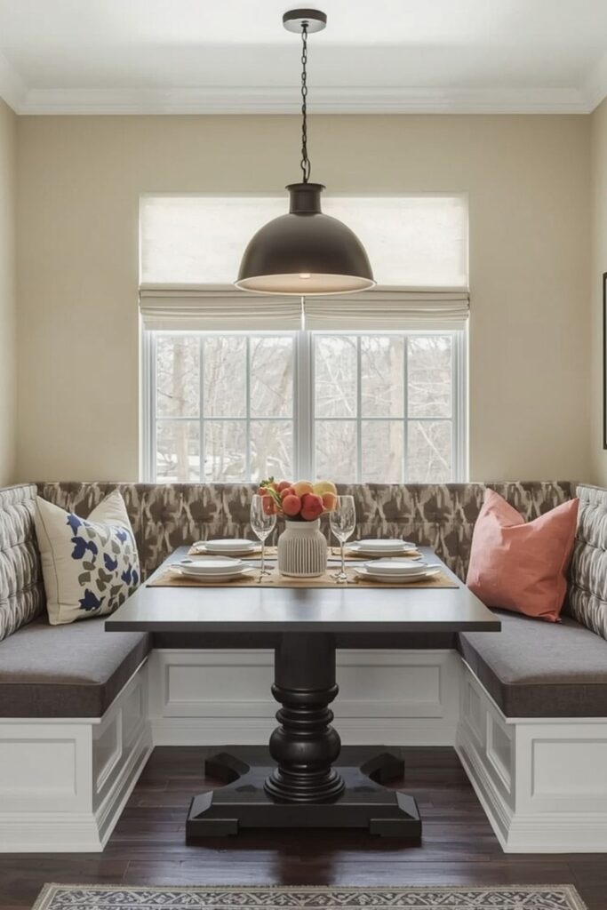 Using cushions and soft fabrics adds comfort and warmth, turning the nook into a place people naturally gather. Storage under the benches can also be added, making this idea practical for small homes. A window-side dining nook often becomes the most loved spot in the house.
