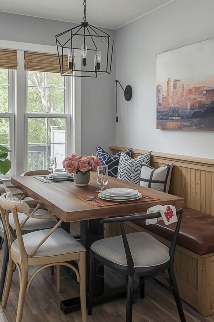Instead of heavy décor, modern nooks rely on materials like wood, metal, and stone for visual interest. This type of dining nook is ideal for homes that prefer a calm, uncluttered look while still offering a comfortable place for daily meals.