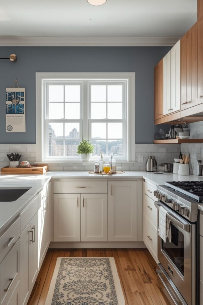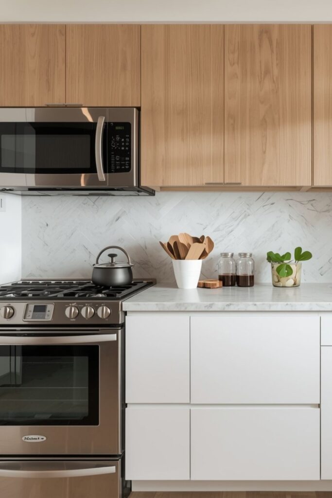 Using too many finishes in a small kitchen can make the space feel fragmented. Compact kitchen planning works best when materials are limited and consistent across cabinets, counters, and backsplashes.