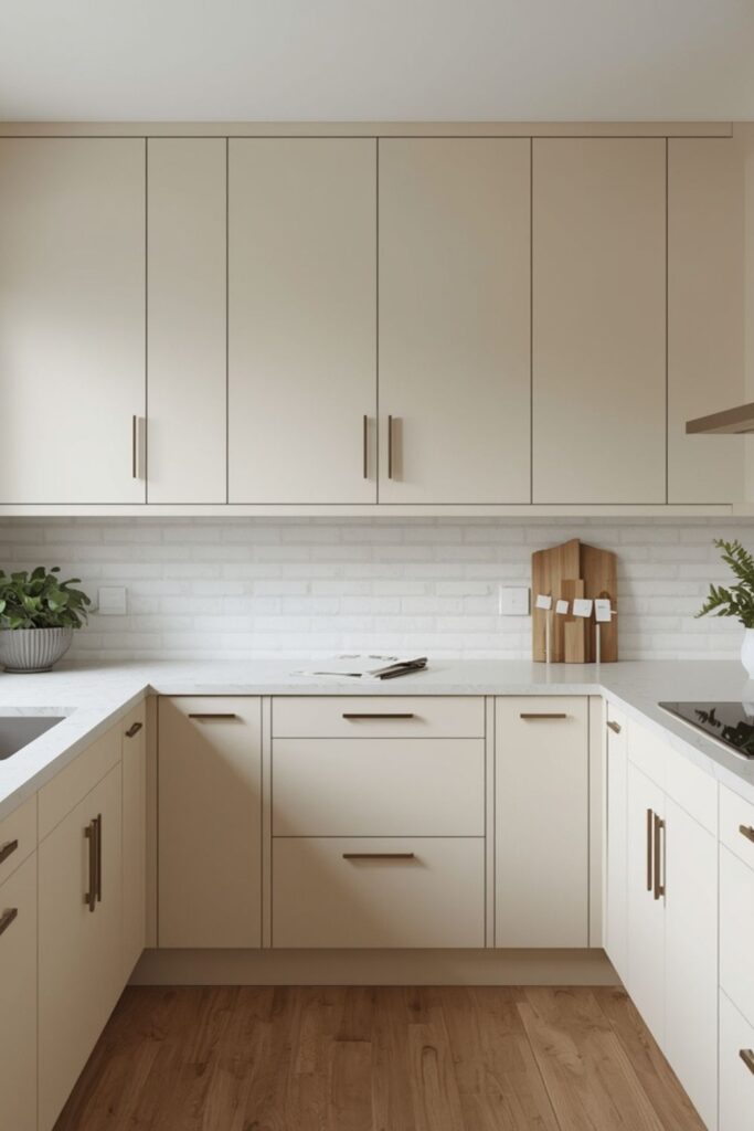 In compact kitchens, cabinet design has a major impact on how spacious the room feels. Flat-front cabinets, handle-less designs, or slim pulls help reduce visual noise. Light colours or warm neutrals further soften the space.