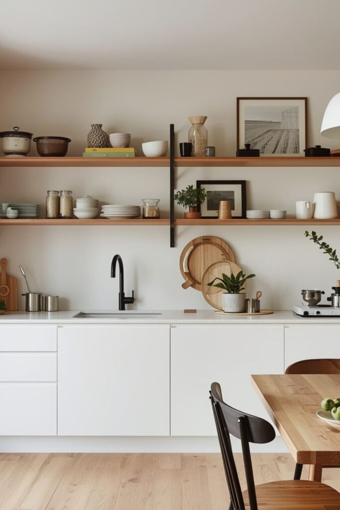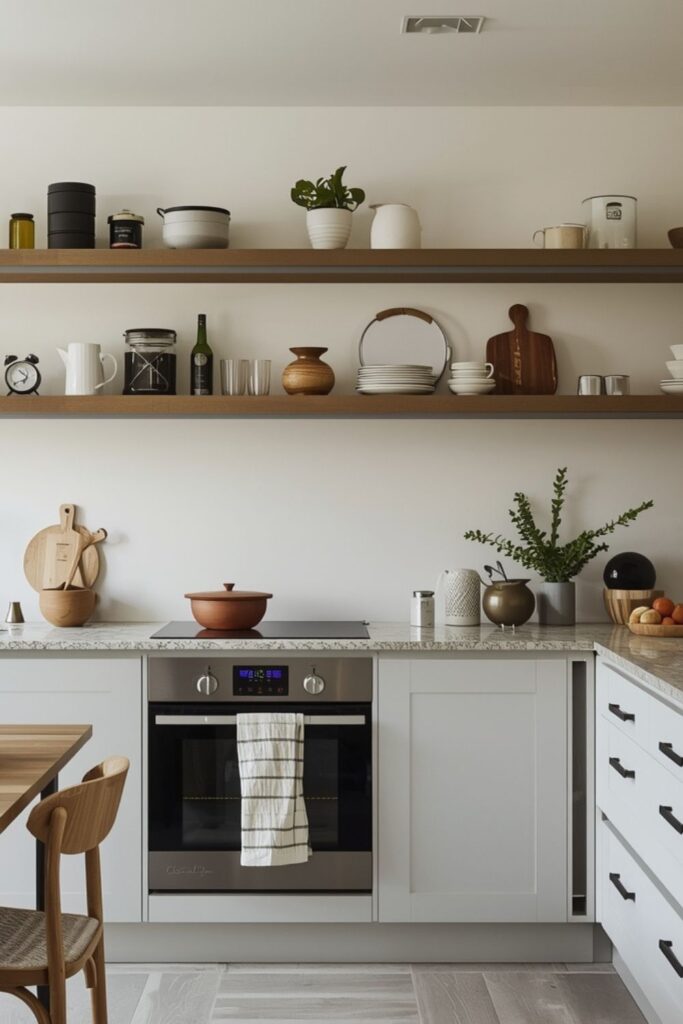 Calm kitchens benefit from decoration that supports the overall atmosphere instead of competing with it. Purposeful accents introduce personality while allowing the shelves to remain grounded and functional.