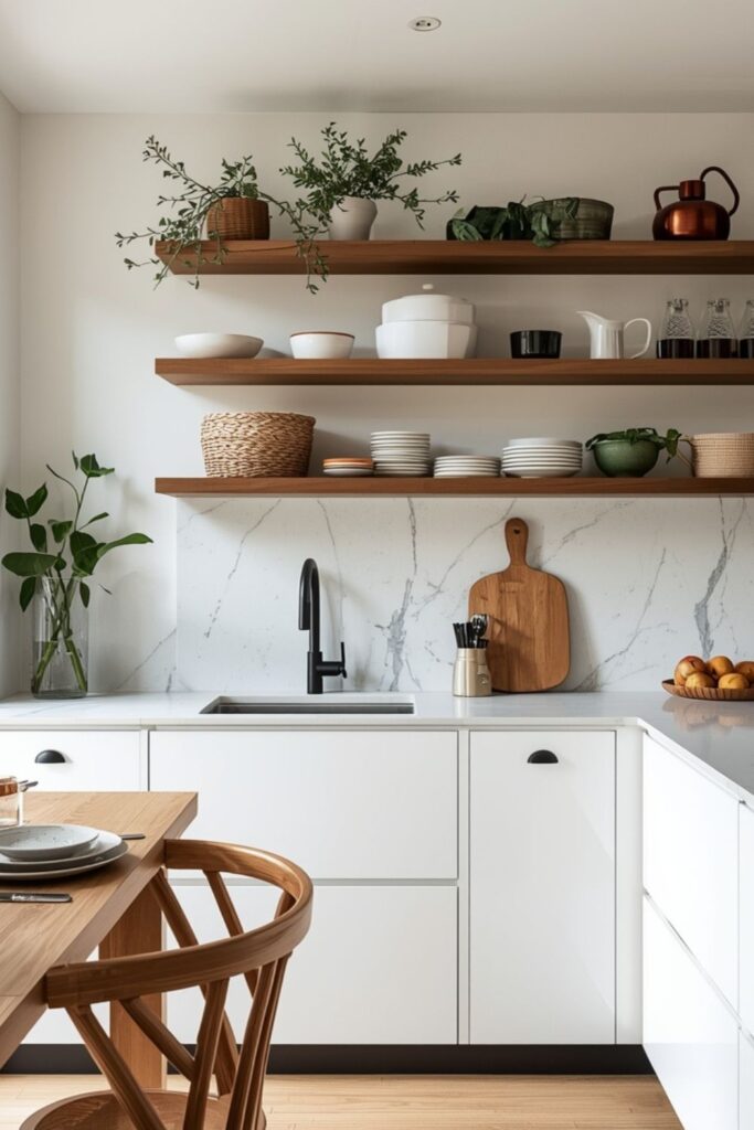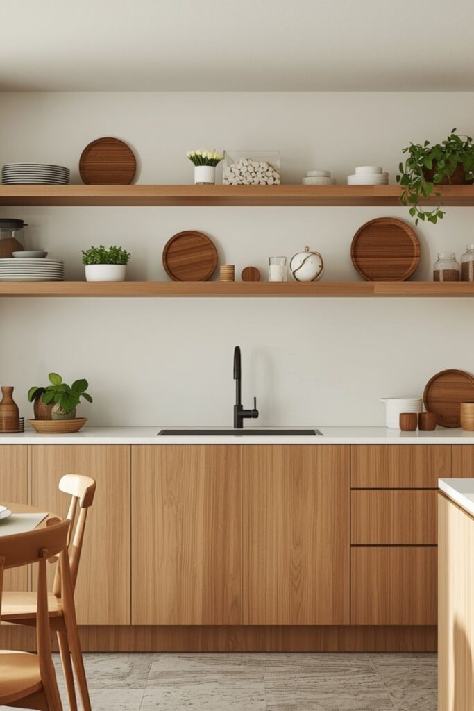 Decoration on open shelves should feel natural rather than deliberate. A single plant, a wooden cutting board, or a neutral ceramic piece can add warmth without disrupting balance. Open shelf styling ideas Pinterest often highlight simplicity because it translates well into real homes.