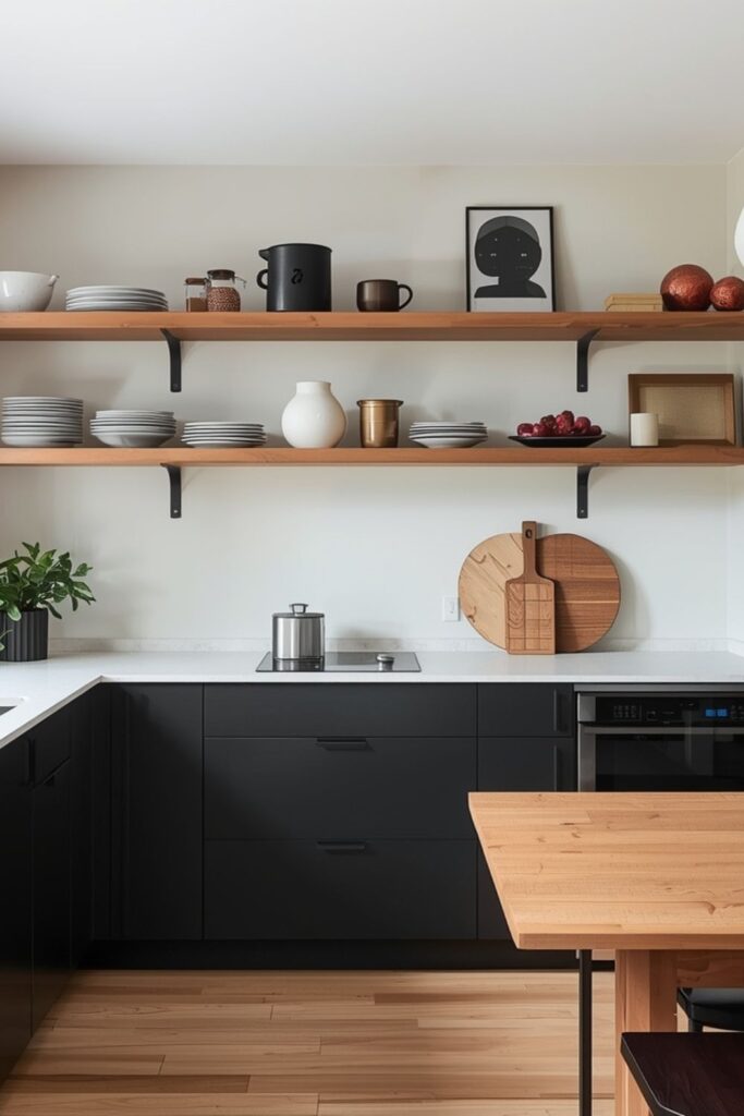 Kitchens with open shelves and cabinets tend to feel more livable over time than fully open designs. Closed cabinets quietly store visual clutter, while open shelves handle lighter, frequently used items. This balance prevents shelves from becoming overwhelming.