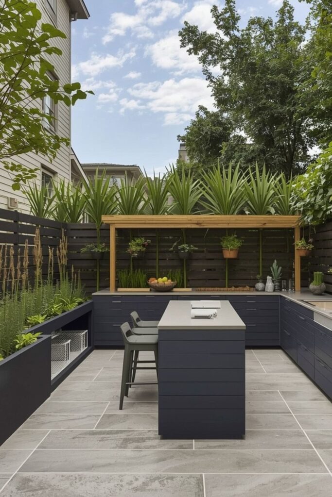A small island can work in urban outdoor kitchens when proportions are carefully controlled. Instead of a full-scale island, a slim counter provides prep space, casual seating, or serving support.