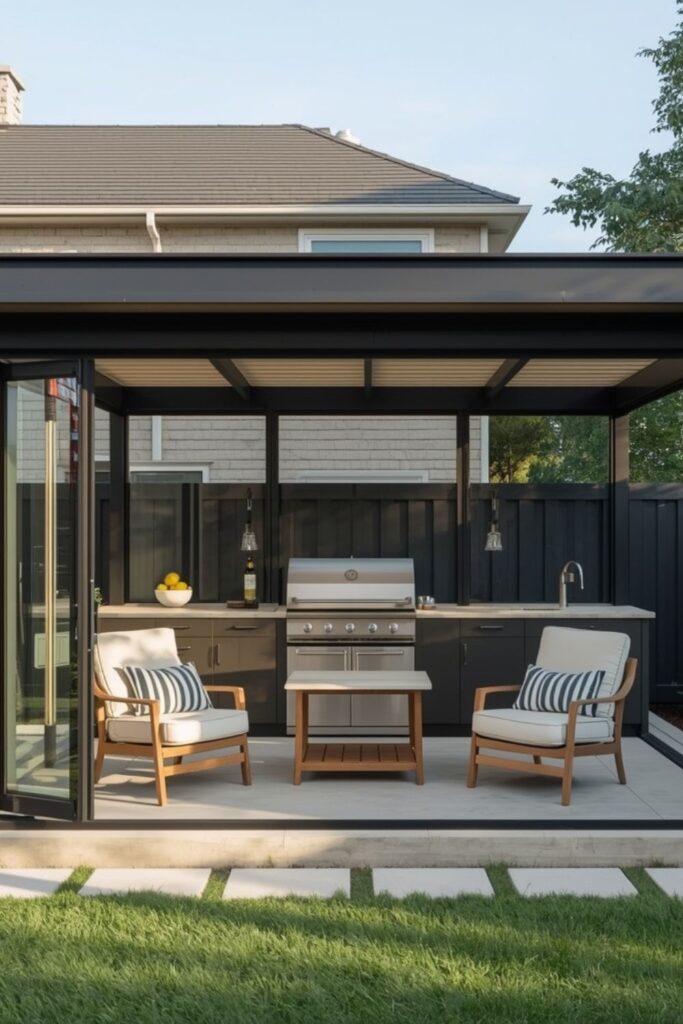 In cities with unpredictable weather, enclosed outdoor kitchens offer practical advantages. Glass panels, sliding doors, or lightweight enclosures protect the kitchen while preserving light and visibility.