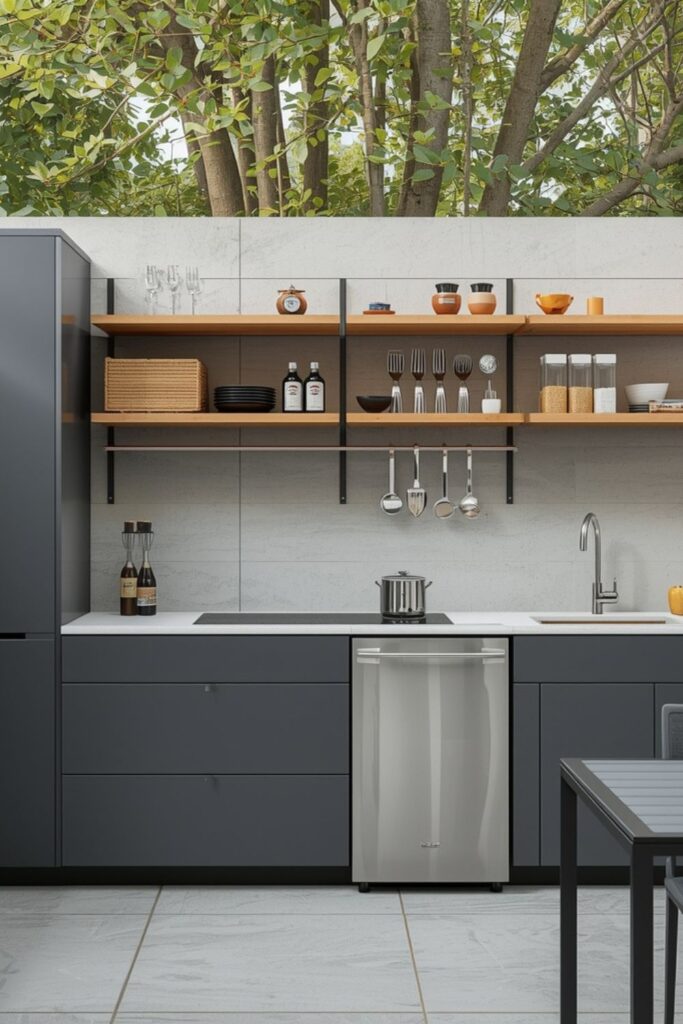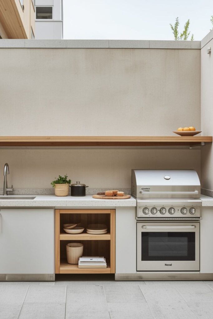 Vertical storage is especially valuable in urban outdoor kitchens where floor space is limited. Tall cabinets, narrow shelves, and wall-mounted racks keep essentials accessible without expanding the footprint.