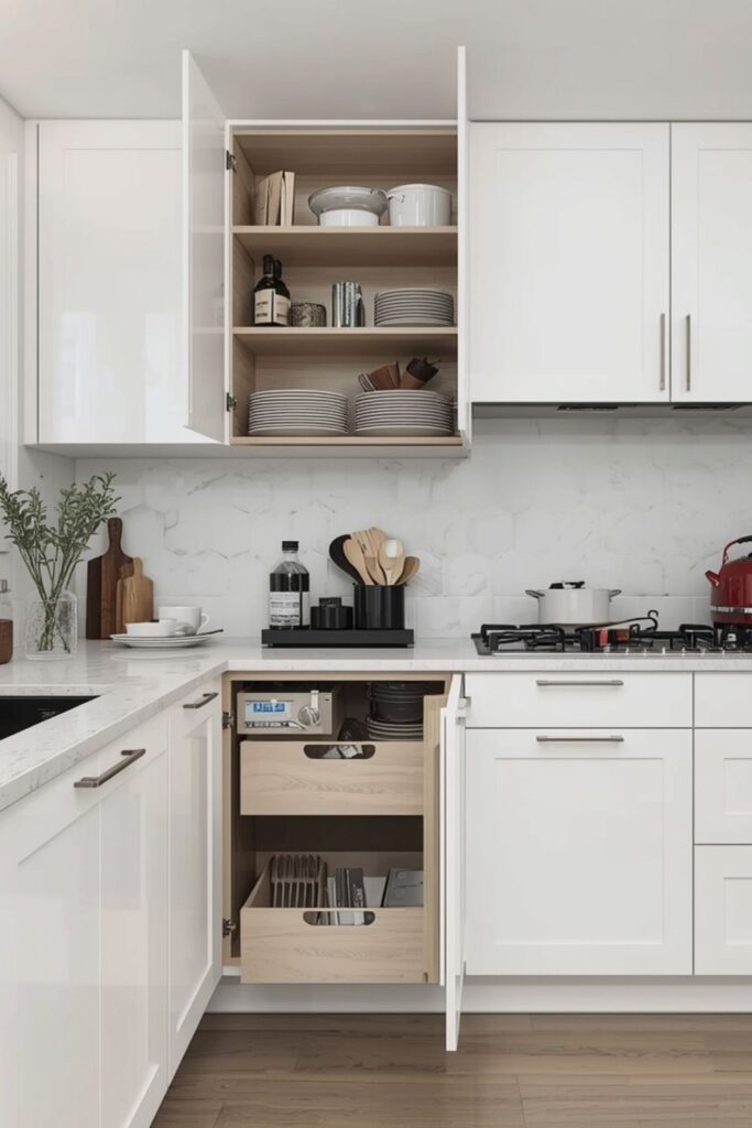 Hidden storage is becoming essential in compact kitchens. Pull-out drawers, corner carousels, and under-sink organizers make better use of every inch. These solutions are perfect for small simple kitchen design layouts.