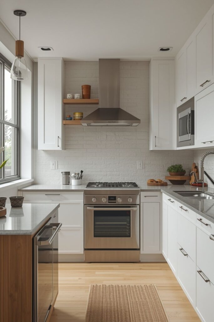 Many small kitchen designs photo gallery collections highlight open shelving paired with closed cabinets. This combination keeps the space practical yet decorative. It works especially well in very small kitchen ideas on a budget.